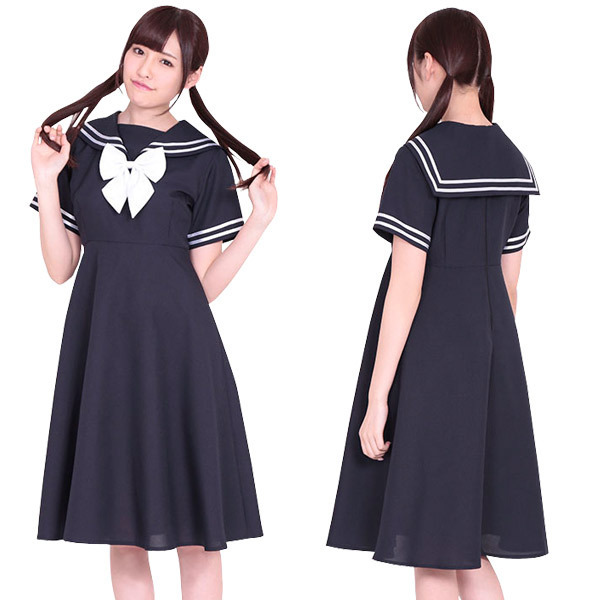 長めのワンピースでお嬢様風に♪紺×白カラーのセーラー服コスプレ。