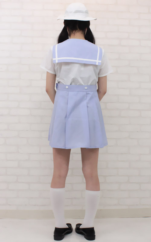 懐かしいゴム付き帽子もセット!淡い色合いが爽やかな夏服仕様の制服コスプレ(M)。
