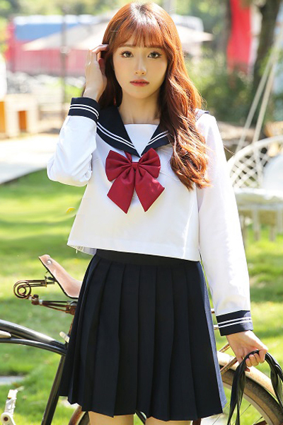 清潔感溢れる紺と白の制服を、真っ赤な大きいスクールリボンで華やかに魅せた長袖仕様のセーラー服。